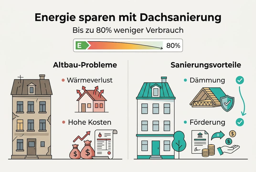 Die gute Nachricht: Wer sein Dach energetisch saniert, kann den Energiebedarf seines Altbaus um bis zu 80% senken. Das ist kein theoretischer Wert, sondern ein realistisches Ergebnis, das viele Hausbesitzer nach einer Komplettsanierung tatsächlich erreichen.