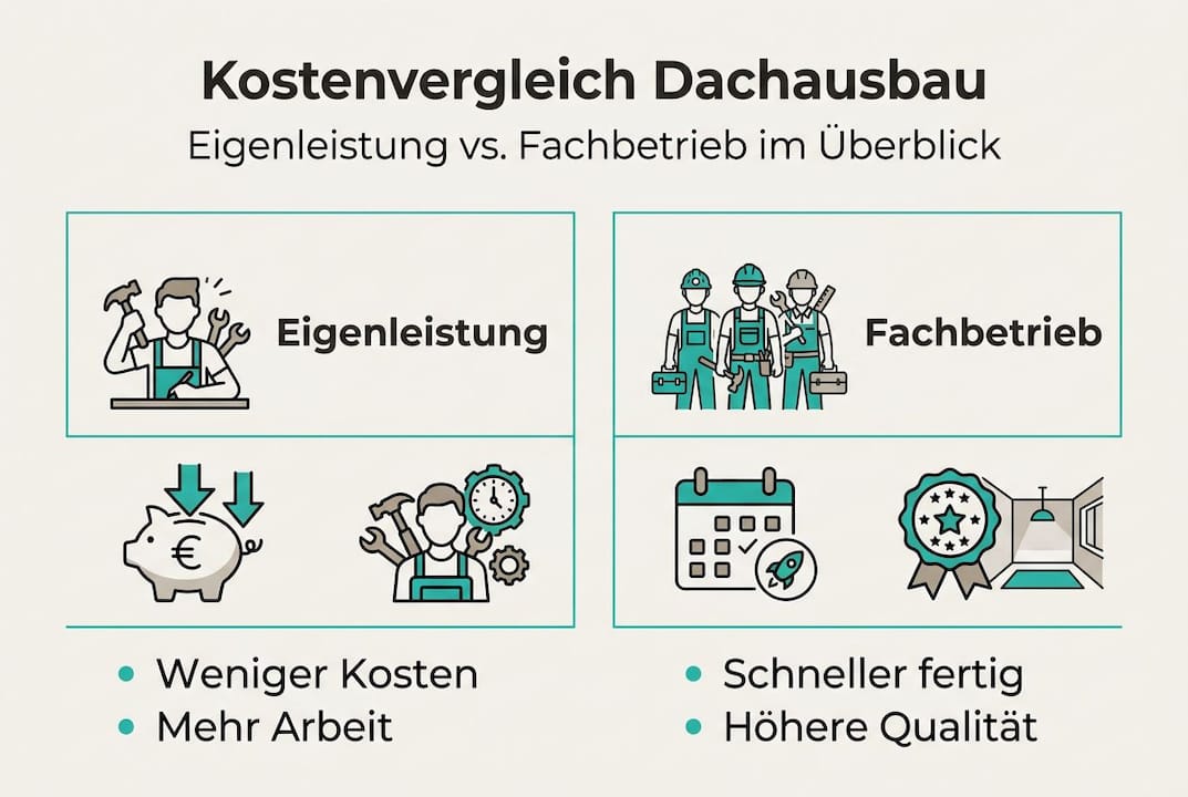 Der klügste Ansatz ist nicht "alles selbst" oder "alles vom Profi". Es ist die bewusste Mischung. Dämmung und Trockenbau: selbst machen, Geld sparen. Statik, Elektro, Dachabdichtung: Fachbetrieb, Sicherheit gewährleisten. Wer diese Grenze kennt und respektiert, holt das Maximum aus seinem Budget heraus.