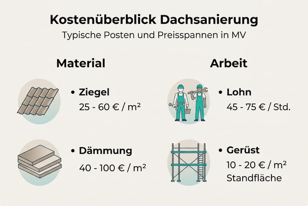 Eine Dachsanierung kostet für ein Einfamilienhaus zwischen 10.000 und 45.000 Euro, und viele Hausbesitzer in Mecklenburg-Vorpommern wissen nicht, wo sie bei der Planung anfangen sollen. Diese Unsicherheit ist verständlich, denn Dacharbeiten sind komplex, die Preise schwanken stark und Fördermittel werden oft gar nicht oder falsch beantragt. Dieser Leitfaden zeigt Ihnen, wie Sie Ihre Kosten realistisch einschätzen, Schritt für Schritt kalkulieren und welche Zuschüsse sowie Kredite Ihnen als Hausbesitzer in MV konkret zustehen. Am Ende wissen Sie genau, worauf es bei der Planung ankommt.