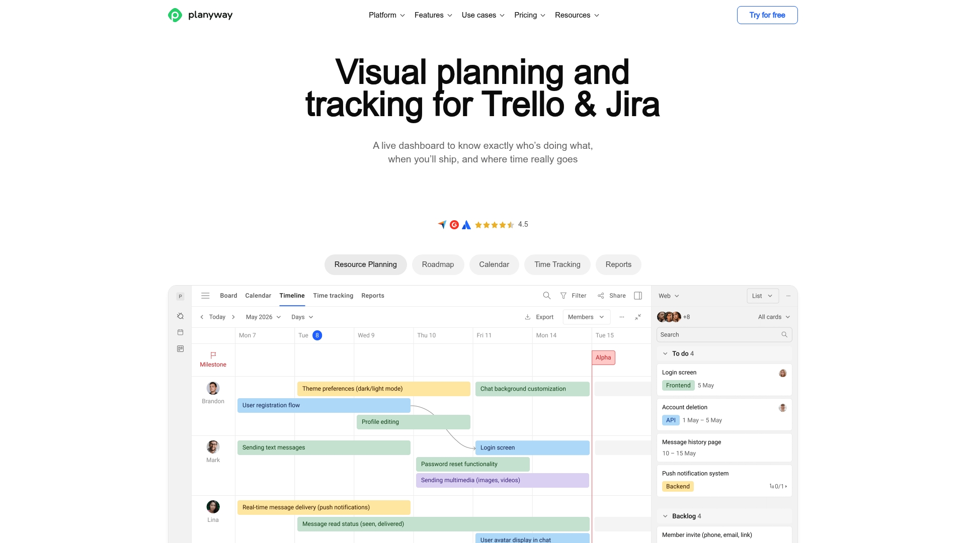 Das besondere an Planyway ist die Kombination aus visueller Timeline und direkter Anbindung an etablierte Tools wie Trello und Jira. Diese Verbindung ermöglicht synchronisierte Pläne ohne doppelte Pflege und klare Ressourceneinsichten.