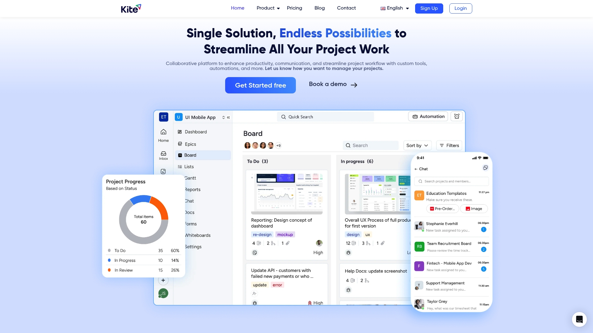 KiteSuite bringt Dashboard für schnelle Einblicke, Sprints für Zyklusarbeit, Taskmanagement zur Nachverfolgung, eine sichere Chatfunktion und Dokumentenmanagement zusammen. Das System liefert zudem Automatisierung und Reporting, um wiederkehrende Abläufe zu reduzieren und Projektstände visuell darzustellen.