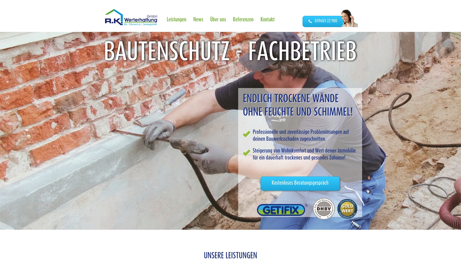 R.K. Werterhaltung GmbH ist ein spezialisierter Fachbetrieb für Bautenschutz und Sanierungstechnik mit klarem Fokus auf Trockenlegung und Abdichtungen. Die Firma punktet mit TÜV-geprüftem Know-how und einem breiten Leistungsspektrum, bietet aber keine öffentlichen Preislisten.